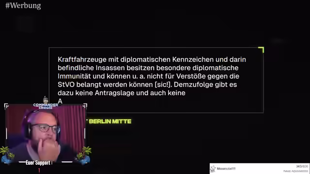 00:01:00Der Stream beginnt mit der Erörterung der diplomatischen Immunität und ihrer potenziellen Kehrseiten. Es wird die Frage aufgeworfen, was passiert, wenn Diplomaten diese Immunität missbrauchen und Straftaten begehen. Einblicke in Statistiken über Verkehrsordnungswidrigkeiten von Diplomaten im Jahr 2024 werden gegeben, wobei die Botschafter von Saudi-Arabien und den USA an der Spitze stehen. Es wird von eigenen Beobachtungen von Falschparken in Botschaftsstraßen in Berlin berichtet und die Konfrontation mit einem Fahrer geschildert, der sich auf eine angebliche Genehmigung der Polizei beruft. Die anschließende Recherche bei verschiedenen Behörden (Berliner Polizei, Straßenverkehrsbehörde, Auswärtiges Amt) ergibt jedoch, dass keine Sondergenehmigungen für Diplomaten existieren. Ein Treffen mit einem Diplomaten aus Bangladesch steht bevor, um ihn mit den Verkehrsverstößen seiner Botschaft zu konfrontieren.