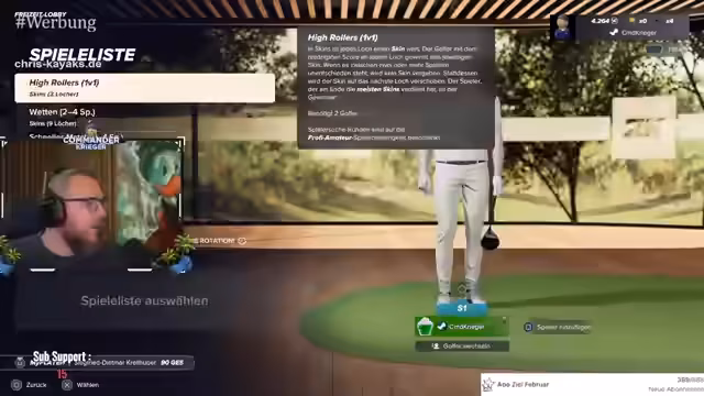 04:54:02Der Fokus verlagert sich von den Theorie auf die praktische Anwendung im Golfspiel 'PGA Tour 2K23'. Der Streamer organisiert ein Spiel im Modus 'Skin Game' für sich und zwei Zuschauer, namens Daubi und Franco. Er navigiert durch das Online-Clubhouse 'Kriegers Clubhouse', lädt die Spieler ein und startet eine Runde. Dabei interagiert er mit dem Chat, kommentiert die Spielsituation humorvoll und versucht, die Herausforderungen des Spiels zu meistern, wie z.B. den starken Wind.