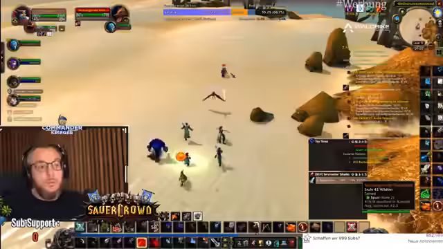 04:40:30Während eines erneuten Versuchs, die Eskort-Quest zu absolvieren, erleidet das Team einen Rückschlag durch einen 'Megapull', bei dem der Streamer mehrere Gegner auf einmal anlockt und knapp überlebt. Der Fokus liegt darauf, die Schildkröte sicher zu geleiten und die Gruppe zusammenzuhalten. Im Anschluss daran klammert sich der Streamer an die positive Dynamik, die durch das Rettungsmanöver entstanden ist, betont aber die andauernden Probleme mit dem Verhalten einzelner Teammitglieder, besonders Lars und Excel.