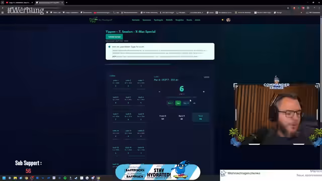 03:18:57Das neue Tippspiel 'Partip' wird beworben, bei dem Teilnehmer mit Twitch-Account in drei Kategorien antreten: Golfer mit Handicap, Golfinteressierte und Zuschauer. Preise umfassen Golfartikel, Schnupperkurse und Holy-Pakete. Der Hauptpreis im Januar ist eine Apple Watch Ultra. Für ein Event am 26. oder 27. Dezember tippen Teilnehmer auf drei Golfplätze (Bahia Beach Club, Playa Grande, Royal Homburger Golf Club), die Trackman-simuliert. Teilnahme ist kostenlos, ohne Spam. Gewinner werden basierend auf Tipps für 52 Löcher ermittelt. Monatspreise zusätzlich, Hauptgewinner erhält Golf-Mitgliedschaft und Video mit dem Streamer.