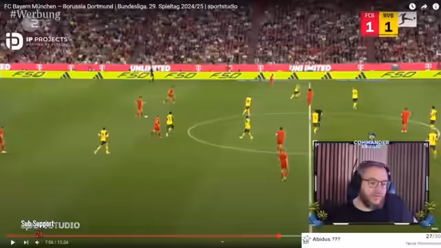 00:00:31Der Stream beginnt mit der Analyse des Bundesligaspiels zwischen dem FC Bayern und Borussia Dortmund. Kompanys Elf agiert zunächst verhalten, während Kovacs Gäste mit maximalem Einsatz und Wille in die Partie starten. Der Gastgeber dominiert zunehmend und erarbeitet sich klare Chancen, unter anderem durch Julian Brandt, die jedoch ungenutzt bleiben. Das Spiel zeichnet sich durch eine geduldige und risikobewusste Spielweise der Bayern aus, um Kontersituationen des BVB zu vermeiden. Der erste Abschnitt endet torlos und die Bilanz der Bayern bleibt trotz Chancenplus ohne Torerfolg.