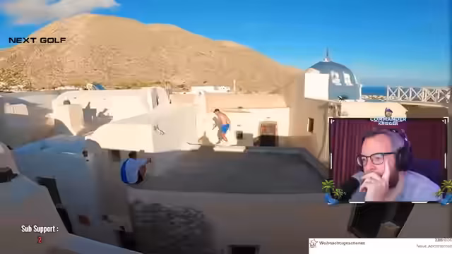 02:47:54Nach den intensiven Rope-Swing-Sprüngen erkundet die Gruppe die Dächer und Gassen einer Küstenstadt auf Santorini. Sie zeigen verschiedene Aussichtspunkte und erkunden eine Höhle im Schlüsselloch-Design. Die Atmosphäre ist gelöst und fröhlich, und die Teilnehmer genießen die Aussicht auf das Meer und die typische Architektur der Region, bevor der Stream endet.