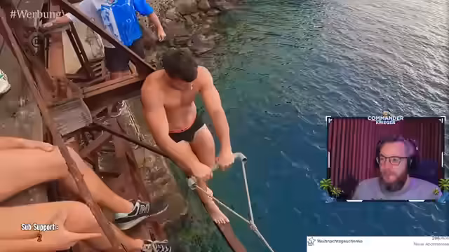 02:08:31Der Stream wechselt den Schauplatz nach Santorini. Die Gruppe erkundet die Küstenlinie und plant, an einem der verbliebenen Kräne für einen Rope Swing Sprung. Das Wetter wird dabei zunehmend unbeständig, mit aufziehendem Gewitter. Nachdem die Teilnehmer die Kletterei gemeistert haben und der erste Sprung stattgefunden hat, entschließt sich Philipp zu einem weiteren, ausgelassenen Sprung, was für reine Unterhaltung sorgt.