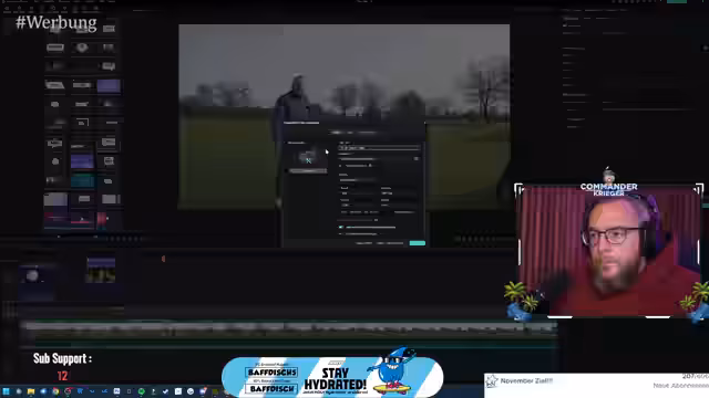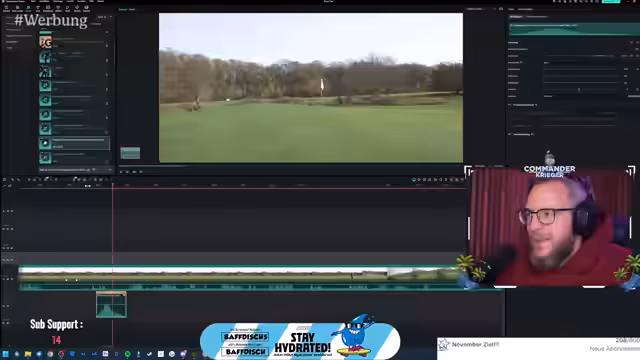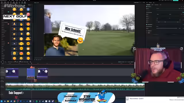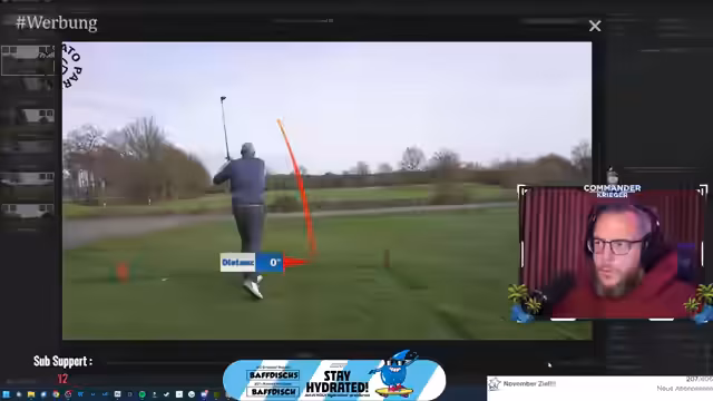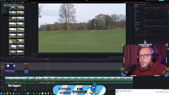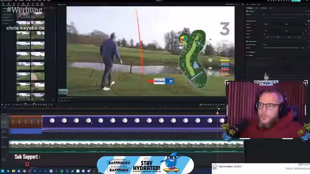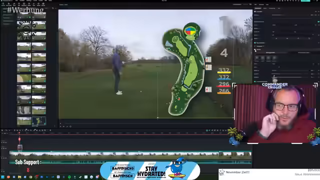 00:02:13Der Stream beginnt mit der Vorstellung eines neuen YouTube-Videos, das auf dem Golf Club Brückhausen gedreht wurde. Der Streamer spielt das 6er Eisen an der ersten Bahn und erklärt die technische Herausforderung, dabei zu sein, da er krank ist. Es folgt ein längerer Abschnitt, in dem er die Anfänge der Videobearbeitung zeigt, insbesondere das Herausarbeiten einzelner Bahnen für den Golfplatz aus dem Hintergrundmaterial, was als sehr zeitaufwändig und kompliziert beschrieben wird.