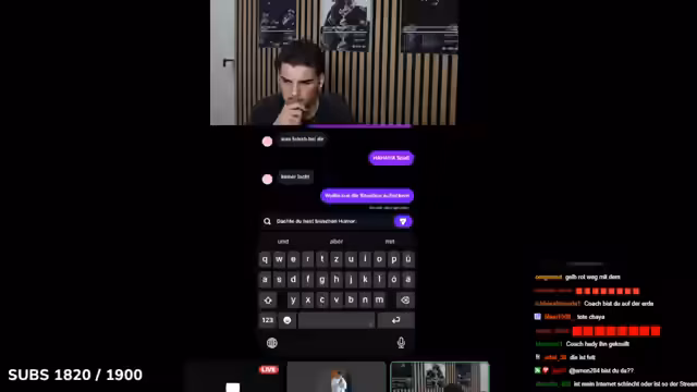 01:55:50Der Stream beginnt mit starker Wiederholung und nutzt mehrmals sehr, sehr, sehr, gefolgt von Begrüßungen und chaotischen Einträgen im Chat. Es wird über eine verborgene Nachricht diskutiert, mit Vorwürfen und Beleidigungen. Der Streamer testet die Chat-User und behauptet, einen dazu zu provozieren zu sehen. Nach einer Loseaktion für 20 Euro folgt ein technischer Problem, bei dem die Chat-Sichtbarkeit behindert wird. Der Streamer nennt sich selbst Peach und scheint technische Unkenntnis zu zeigen.