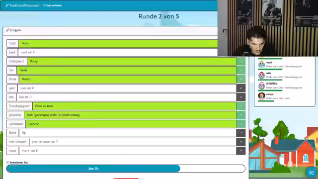 00:16:05Das Spiel schreitet voran mit verschiedenen Kategorien, bei denen Teilnehmer Kreativität und Wissen zeigen müssen. Es kommt zu humorvollen und manchmal abstrusen Antworten, die den Stimm im Chat halten. Der Streamer gibt regelmäßig Minuspunkte für falsche oder nicht den Regeln entsprechende Antworten. Teilnehmer wie Willi, Rohat und Eli konkurrieren um die besten Punktzahlen und interagieren oft mit dem Chat während des Spiels.