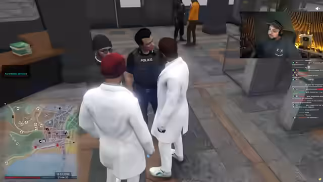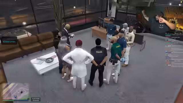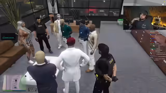 01:13:02Zum Ende des Streams wird eine neue Situation inszeniert, die sich um einen Bewerber für eine Stelle im MD dreht. Der Bewerber, der angeblich ausgeraubt wurde, spricht mit einem Chief, um eine Einstellung zu erreichen. Es entsteht ein Konflikt, da der Chief Einstellungsstopp verkündet. Der Bewerber beharrt auf seinem Anliegen und versucht den Supervisor zu überzeugen, was in einem offenen, ungelösten Konflikt endet und die absurde, institutionelle Parodie des Rollenspiels abschließt.