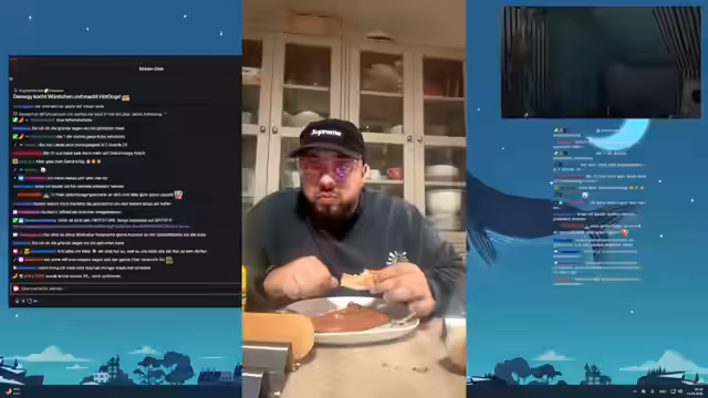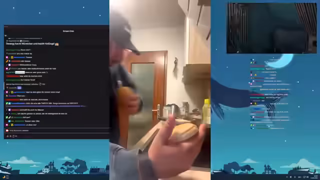 04:59:41Der Streamer bereitet Geburtstagssnacks vor, hauptsächlich Hot Dogs. Es gibt ein langes Gespräch über die Zubereitung und die Zutaten. Der Streamer zeigt seinen Prozess und interagiert dabei mit dem Chat, der Tipps gibt oder Kommentare abgibt. Dies führt zu humorvollen Situationen und persönlichen Anekdoten über Kocherfahrungen und Vorlieben.