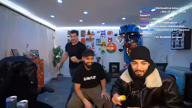 00:55:38Es findet ein scheinbar spontanes Spiel statt, bei dem die Streamer gegenseitig Rollen zuweisen, um zu beleidigen. Dabei identifiziert sich einer als 'Sammy' und der andere als 'Daniel Slump'. Sammy wirft Daniel vor, Kameraprobleme zu haben und nur durch Egos Hilfe überhaupt streamen zu können. Die Interaktion ist geprägt von ständigen 'Bruder'-Anreden und einer wechselseitigen Herausforderung, wer mehr Kapazitäten hat.