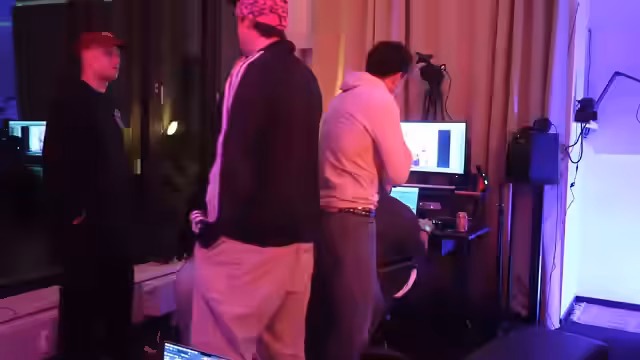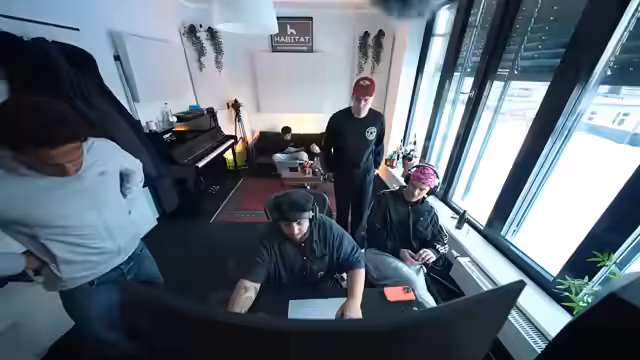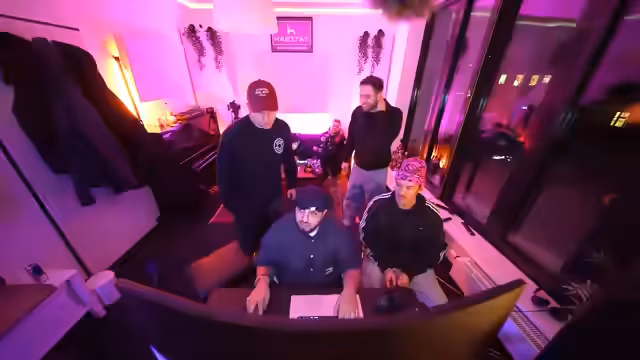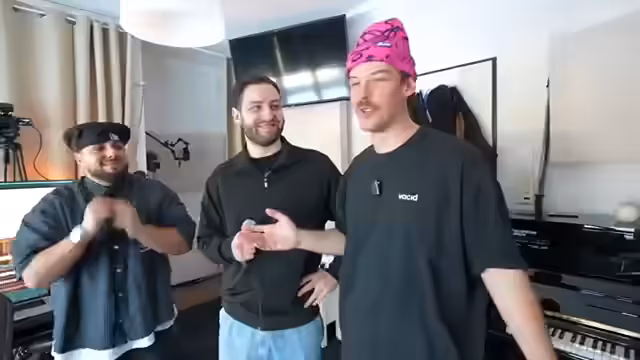 00:09:30Der Stream startet im Musikstudio in Hamburg mit den Produzenten Adi, Paul und Denerji. Zunächst wird die technische Einrichtung wie Mikrofone und Kabel besprochen. Ein Fokus liegt auf der richtigen Positionierung der Kameras und der Produktion im Musikstudio. Die Hauptperson begrüßt den Musiker Jubin, der aus der deutschen Rapszene bekannt ist, und lobt sein Talent. Man plant, gemeinsam einen neuen Song zu produzieren, speziell in spanischer Richtung. Das Ziel ist es, einen Hit im Stil von Bad Bunny oder Gypsy Kings zu kreieren.