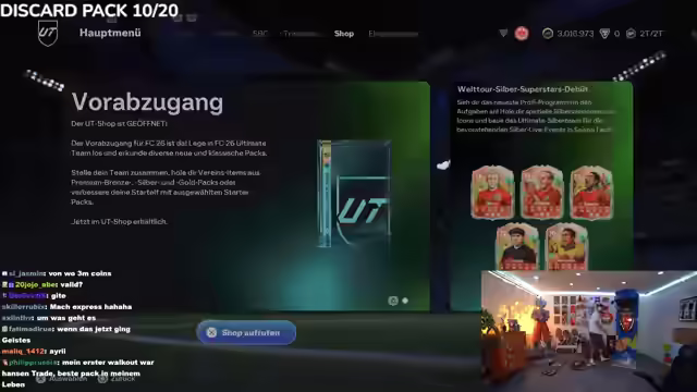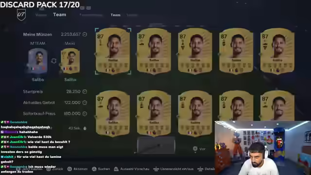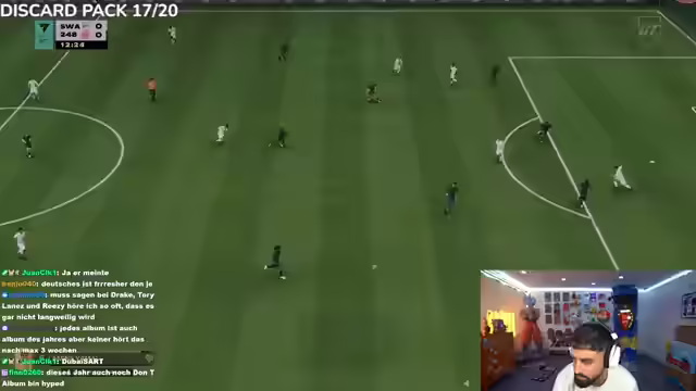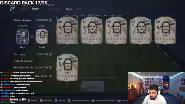 03:08:46Es werden Packs in EA FC 26 geöffnet, wobei es zu einem Frauen-Walkout kommt, was für gemischte Gefühle sorgt. Es wird angekündigt, keine weiteren Points aufzuladen, da es den Kopf verrückt mache. Es wird überlegt, welches Lied in die Woche kommt. Es werden untradable Karten gezogen, darunter Ishak, dessen Preis überraschend hoch ist. Es wird diskutiert, ob der Markt eingebrochen ist und wie viel Donnarumma kostet. Es werden Hunter-Karten verteilt und ein Manager für Valverde gesucht. Es wird überlegt, ob ein argentinischer oder Uruguay-Manager benötigt wird. Es wird über die Taktiken im Spiel gesprochen und wie man die eigene Spielweise entwickeln muss. Es wird beschlossen, mit den aktuellen Taktiken zu spielen und die Bank mit neuen Spielern aufzufrischen. Es wird überlegt, Justin und Oso zu kaufen. Es wird ein Rivals-Spiel gestartet, wobei die Taktiken automatisch eingestellt sein sollen. Es wird über Francesco Totti gesprochen und wie sympathische Spieler bevorzugt werden. Es wird der Fehler angesprochen, sich zu sehr auf einen neuen Spieler zu konzentrieren. Es wird überlegt, Power-Shot-Trades zu nutzen und das Team als krank bezeichnet.