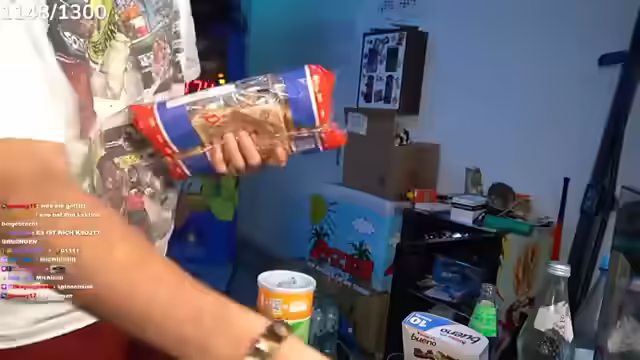 04:53:51Der Streamer präsentiert einen Einkauf, den er für seine Gäste bei Flink getätigt hat, um zu zeigen, dass er ein guter Gastgeber ist. Er zählt verschiedene Snacks und Getränke auf, darunter Ungarischchips, Schokobons, Pringles, Schokobrötchen, Snack Kids, Pommes Chips, Fritz Cola, Powerade, Zewa, Bueno, Apfelringe, M&Ms, Oreos, Corny-Riegel, Aluta, Katjes saure Wunderland, Fred Ferkel, Trolley Glühwürmchen saure, Airwaves Kaugummis und Fibrierst Lufterfrischer. Er zeigt, wie er die Einkäufe in seinen Kühlschrank packt und bedankt sich bei Lin und Rauers für den Kühlschrank. Er fragt den Chat, wo er die Chips lagern soll und entsorgt alte Glasflaschen vom Samra-Stream.