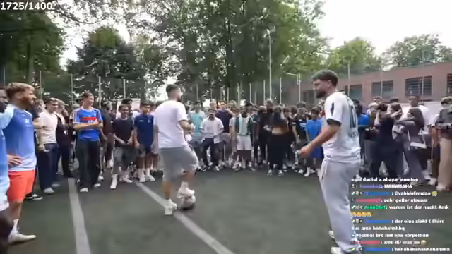01:07:59Der Stream startet mit der Ankündigung des finalen Duells im 1VS1 IRL FUẞBALL TURNIER. Es geht um den Gesamtsieg von 1.500 Euro zwischen den Spielern Koya und Anil. Streamer Daniel ermutigt beide Spieler, mit vollem Einsatz zu agieren und macht deutlich, dass jedes Tor zählt. Nach der finalen Anleitung wird das Duell freigegeben und die Kontrahenten beginnen ihre Duelle.