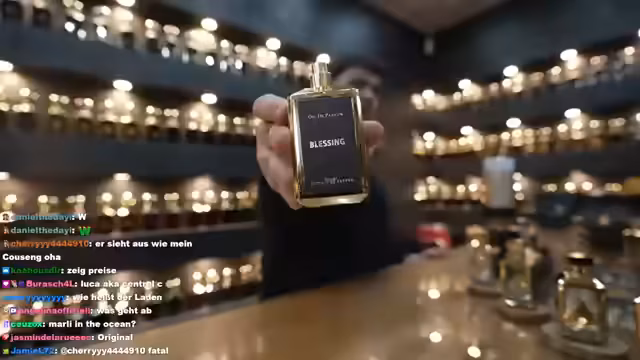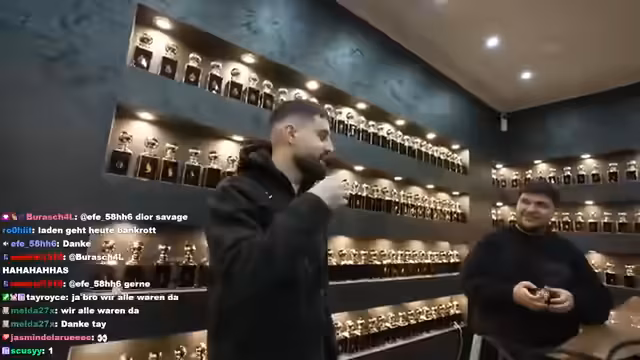 00:59:03Im Parfümladen inszeniert der Streamer ein Verkaufsgespräch, bei dem er die Rolle eines Kunden einnimmt, der ein Parfüm für ein Date sucht. Der Verkäufer empfiehlt 'Arabian Night', einen Duft, der angeblich viele Komplimente einbringt und eine beliebte Amber-Note hat. Der Streamer ist beeindruckt und möchte den Duft direkt auf seiner Haut testen. Anschließend fragt er nach einem zimtigen Duft für die Weihnachtszeit und bekommt 'Oud of Greatness' empfohlen, der angeblich von Scheichen in Dubai und Syrien getragen wurde und sogar Kanye West geholfen haben soll, Kim Kardashian zu beeindrucken. Der Streamer ist begeistert und kauft beide Düfte in voller Größe. Als Neukunde erhält er zusätzlich einen kleinen Roller für unterwegs als Geschenk. Der Streamer lobt seine eigenen Verkaufsfähigkeiten und die Intensität seiner Stimme, wenn er ernst spricht. Er testet den neuen 'Birnbaum'-Duft von Enno, der als sehr gut beschrieben wird und Noten von Birne, Ingwer und Mandarine enthält. Der Streamer bedauert, dass er selbst noch keinen davon besitzt. Es wird erwähnt, dass der Duft noch nicht offiziell auf dem Markt ist, aber bereits an einige Leute verteilt wurde. Der Streamer äußert den Wunsch, einige Parfüms an die draußen wartenden Fans zu verteteilen.