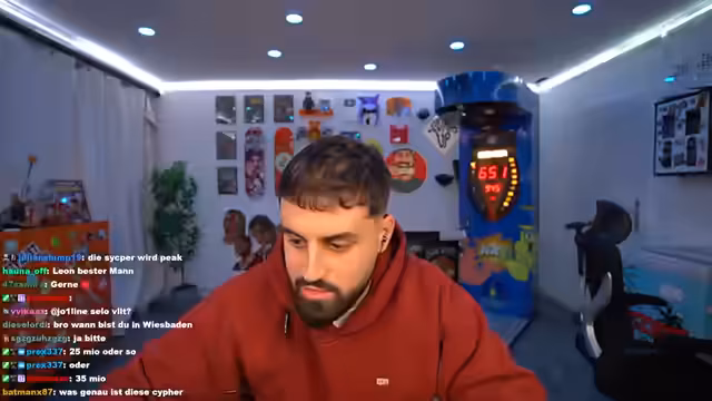 02:29:14Nach einem von Freunden bestellten und verarschenden Essen startet eine spontane Aktion. Ein Freund bietet dem Streamer für einen Tag seine Kreditkarte an, um einen IRL-Stream durch Frankfurt zu machen und dort an der Kasse seines Ladens Parfüm an Zuschauer zu verschenken. Parallel dazu kündigt der Streamer eine Musikmarathon-Nacht für Mitternacht an, bei der er Songs von Künstlern wie Mero, Slams Up und Jazik streamen wird. Die Stimmung ist begeistert und der Streamer bezeichnet dies als seinen persönlichen Höhepunkt und ein Leben auf Easy Mode.