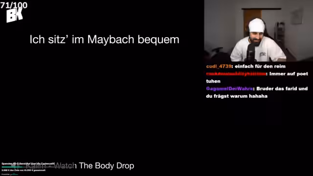 01:32:01Nach einer Pause vom Hauptthema widmet sich der Streamer verschiedenen abschweifenden Themen. Er listet bekannte Zeilen aus dem Deutschrap auf, die auseinandergenommen wurden, und macht sich über rapperische Übertreibungen lustig, wie die Erwähnung eines Kernspintomografen in einem Song. Im Anschluss startet er eine von Zuschauern vorgeschlagene Song Competition, bei der die Community Songs vorschlägt, die der Streamer dann analysiert oder anhört. Der Fokus liegt auf der Interaktion und dem Spaß mit der Community.