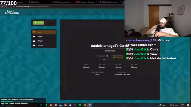 02:11:05Vor Beginn des eigentlichen Song Battles wurde der Stream mit technischen Vorbereitungen und Anreizen für die Community gestartet. Daniel Slump erwähnte den Wunsch nach einem Boxautomat, um Aggressionen abzubauen, und testete das Voting-System, da es Probleme gab. Er forderte die Zuschauer auf, die Abonnements zu vervollständigen und Spenden zu tätigen, um die Community zu stärken. Kurz darauf wurde das offizielle Format des Abends bekannt gegeben: ein Song Battle mit ausschließlich im Jahr 2025 erschienenen Liedern, bei dem das Publikum per Abstimmung über den Ausgang entscheidet.