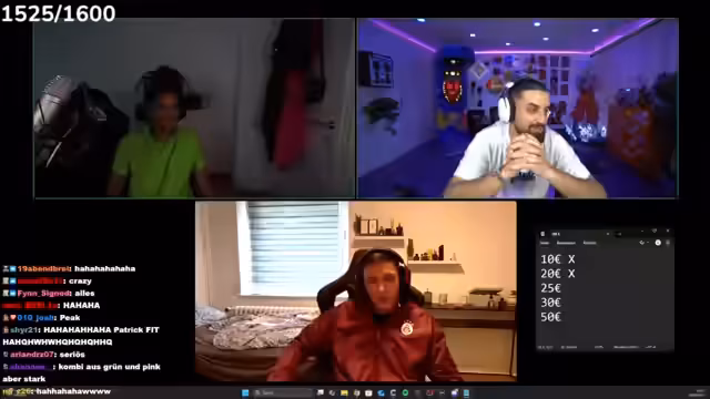 00:52:49Der Stream beginnt mit einem ausgiebigen Outfit-Check, bei dem der Streamer eine pinke Hose trägt und über einen Lacoste-Polo diskutiert, den er nur im Stream trägt. Danach startet eine Reihe von Quizfragen mit steigendem Schwierigkeitsgrad und Geldgewinnen. Die Fragen sind anfangs sehr einfach, zum Beispiel nach der Farbe eines Smaragdgrüns oder der Sprache in Brasilien. Der Streamer agiert dabei selbstbewusst und gibt seine Antworten mit Nachdruck bekannt, während der Chat aktiv an der Beantwortung beteiligt ist.