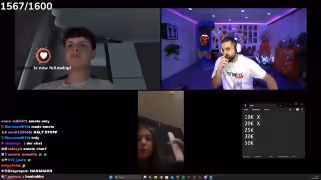 01:43:51Nach anfänglichen technischen Schwierigkeiten mit der Stream-Software und Alerts werden mehrere Runden des Spiels 'Split or Steal' vorbereitet. Der Streamer wählt die Teilnehmer wie Rex, Baran, Kilo und Markus aus, welche durch Follows, Geschenke und Abonnements ausgewählt wurden. Es werden erste Fragen gestellt, um das Spiel einzuleiten, wie zum Beispiel nach dem chemischen Symbol für Wasser. Das Ziel ist es, die Fragen zu beantworten, um das Preisgeld zu erhöhen.