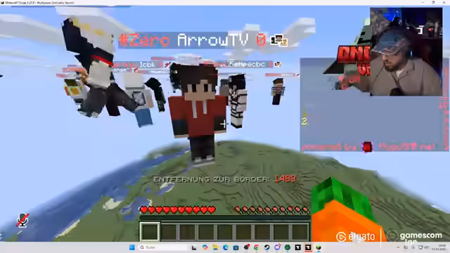 00:35:25Nach den anfänglichen technischen Schwierigkeiten kann der Streamer erfolgreich an einem Minecraft-Event teilnehmen. Er ist beeindruckt von der hohen Internetgeschwindigkeit der Gamescom, die den Download von über 100 Gigabyte in wenigen Minuten ermöglicht. Während des Spiels unterhält er sich mit der Community und geht auf Fragen ein. Der Streamer ist ungeduldig, da Armin sich weiterhin primär mit Mädchen unterhält, anstatt technisch zu unterstützen. Es kommt auch zu einem Witz über die geringe Zahl an Abos im Chat. Der Fokus liegt nun auf dem gemeinsamen Spielen und der Interaktion mit anderen Streamern auf der LAN.
