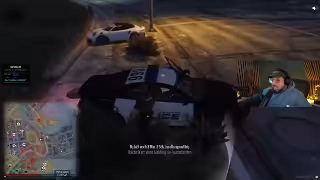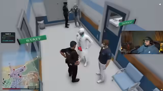 04:52:28Der Streamer beobachtet verdächtige Vorkommnisse im Krankenhaus, wo laut seiner Aussage 30 Personen in einem einzigen Raum tanzen, was für die Patientinnen eine Störung darstellt. Dies veranlasst ihn, einen sogenannten "Dispatch" zu initiieren. Die Szene wechselt abrupt zu einer Verfolgungsjagd auf einer Autobahn, bei der eine weitere Geldkassette im Spiel ist. Der Streamer versucht, den Verdächtigen zu stoppen, verliert aber aufgrund von Funkproblemen und unvorhergesehenen Wendungen das Ziel aus den Augen.