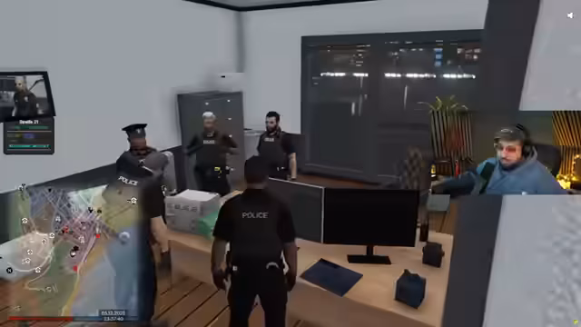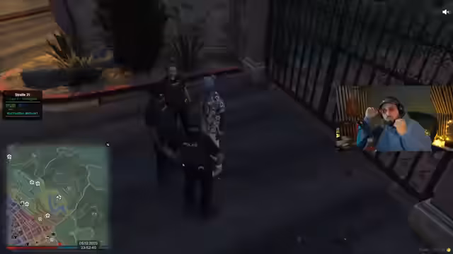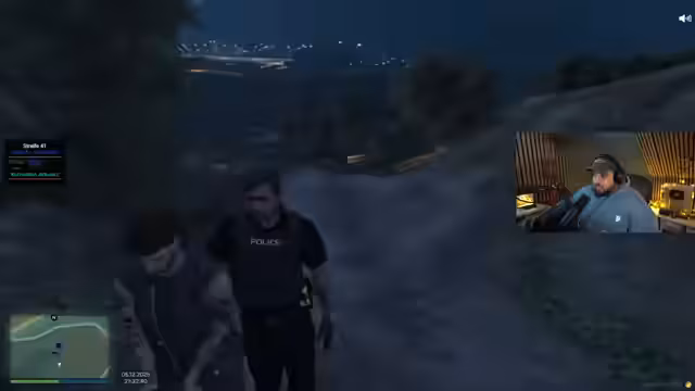 00:55:35Der Streamer beginnt mit seinem geplanten GTA RP-Spiel. Er übernimmt die Rolle von Polizist 'Herr Kato' und fährt mit seinem Partner 'Herr Swabbel' Streife im Stadtpark. Die Szene ist von chaotischem Verhalten und mangelnder Kommunikation zwischen den Beamten geprägt. Ihr erster Einsatz führt sie zu einer angeblichen Schlägerei, bei der sie mehrere verdächtige Personen festnehmen wollen. Die Interaktion zwischen den Charakteren ist geprägt von Autorität, aber auch von amateurhaften und unkoordinierten Abläufen.