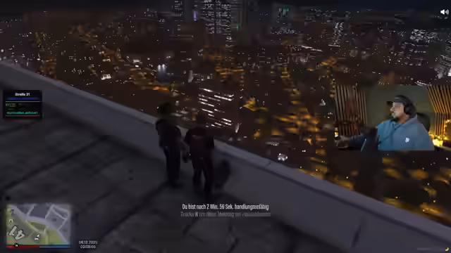 06:44:57Ein weiterer Neuankömmling fragt die Polizei nach Möglichkeiten, Freunde in der Stadt zu finden, was die Beamten mit sichtlichem Unverständnis und Irritation quittieren. Sie lehnen jegliche soziale Unterstützung ab und beschränken ihre Rolle auf reine Notfallhilfe. Nach dieser abschlägigen Antwort verabschiedet sich der Streamer von seinem Publikum, kündigt einen Stream am folgenden Tag an und beendet die Sendung in der frühen Morgenstunde nach über sieben Stunden.