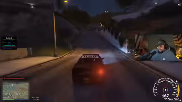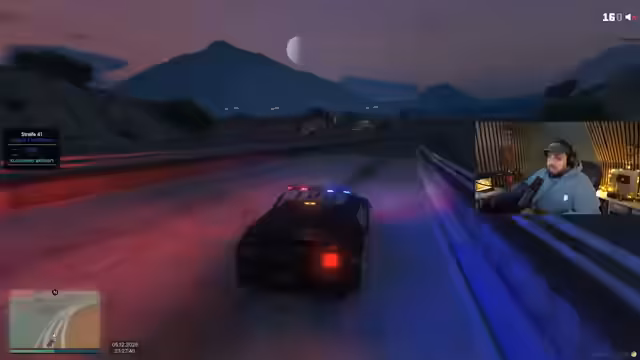 05:03:03Bei einer Kontrolle wird ein Fahrer ohne gültigen Führerschein angetroffen. Dieser gibt an, eine Waffe im Kofferraum zu haben, die aber laut Streamer nicht vom Fahrer stammt. Die Situation wird für den Fahrer zum Glück entspannt, da die Beamten keine weiteren Verstöße finden und ihn ziehen lassen. Die Aufmerksamkeit verlagert sich sofort wieder auf eine neue, extrem schnelle Verfolgungsjagd auf der Autobahn. Der Streamer und sein Kollege verlieren das Ziel bei dem Versuch, es mit einem schlechten Auto einzuholen, und beschweren sich über die mangelnde Qualität des Dienstfahrzeugs.