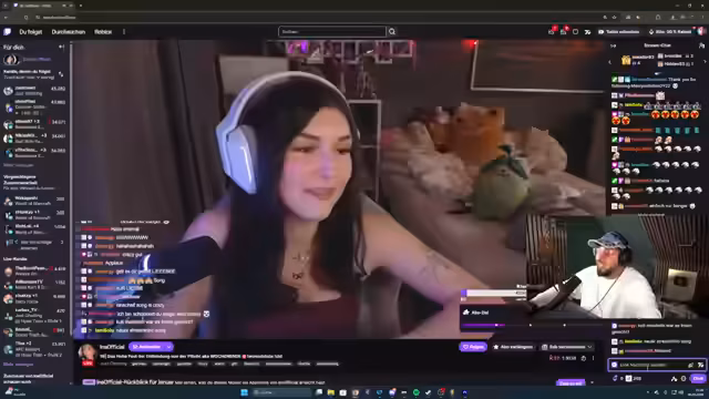 02:03:02Die Unterhaltung wechselt thematisch, als der Streamer über mögliche Kooperationen mit anderen Content-Creators wie Kim Kalani nachdenkt und Fragmente von deren Streams zeigt. Gleichzeitig gibt es wiederholt technische Schwierigkeiten; so wird ein gefilterter Clip von TikTok eingeblendet, der den Stream irritiert. Der Streamer zeigt sich unsicher, ob der gezeigte Inhalt gegen die Richtlinien von Twitch verstößt, und sucht um Rat im Chat. Auch der spontane Versuch, einen neuen Song mit dem Streamer "Baron von Zwiebelschreck" aufzunehmen, wird durch technische Unannehmlichkeiten unterbrochen.