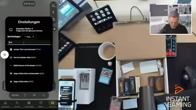 04:30:15Der Scan-Prozess beginnt, aber es treten sofort technische und organisatorische Probleme auf. Der Streamer muss zuerst die Sprache des Scanners auf Deutsch umstellen und jeder Karte muss manuell die Edition, in diesem Fall 'Vierte Edition', zugewiesen werden, da dies nicht automatisch erkannt wird. Dieser Prozess ist sehr aufwendig und zeitaufwendig. Zusätzlich stoßen Hardware-Probleme auf, da das Display des Telefons dupliziert werden muss und die Bildschirmeinstellungen des Streamingsystems die Scanner-App stören könnten.
