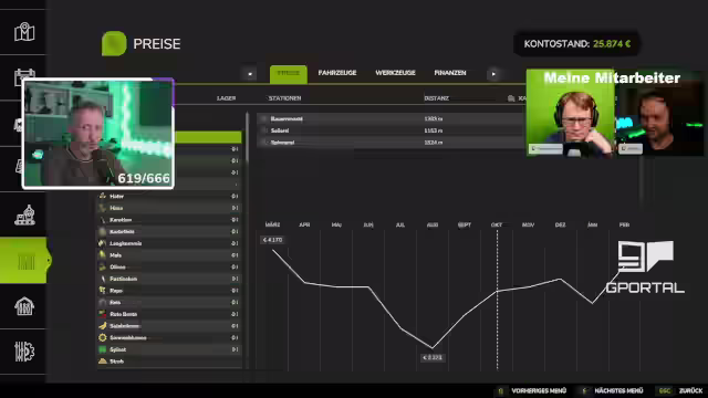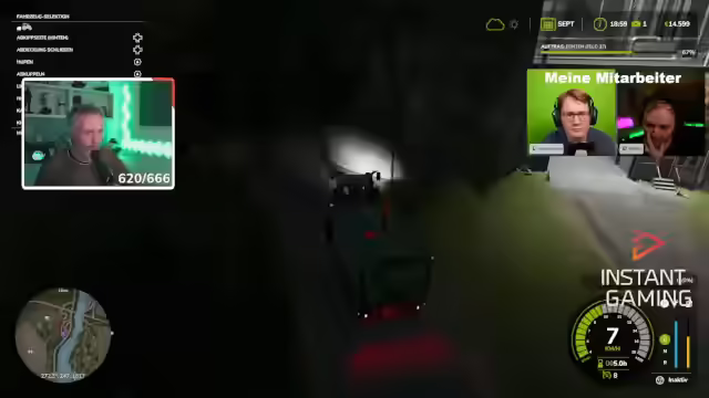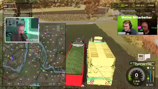 00:18:21Devitor ist nun auch im Stream dabei. RGB hat sich auf den Weg zum Abgabeort am anderen Ende der Karte gemacht. Der Auftrag wird als sehr schwierig eingeschätzt. RGB berichtet von einem Unfall mit einem Bus, der ihm die Vorfahrt genommen hat. Der Streamer kritisiert die geringe Bezahlung von 7000 Euro für den aufwendigen Auftrag. Debitor soll helfen, indem er mit einem kleinen Anhänger die Ernte abtransportiert. Der Streamer gibt Anweisungen zur Bedienung des Tempomaten und zur synchronen Fahrt. Es wird festgestellt, dass der Anhänger von Debitor sehr klein ist und schnell voll wird. RGB ist noch 1,2 Kilometer vom Abgabeort entfernt. Es wird ein Grafik-Bug festgestellt, der die Befüllung des Anhängers falsch anzeigt. RGB hat Probleme mit dem untermotorisierten Miettraktor und muss einen anderen Weg suchen. Memre hat eine Abkürzung über die Felder genommen. Es wird überlegt, was man mit Pastinaken kochen kann. Die Gruppe hat wenig Geld und kann sich keinen größeren Anhänger leisten. Trotzdem wollen sie den Auftrag zu Ende bringen.