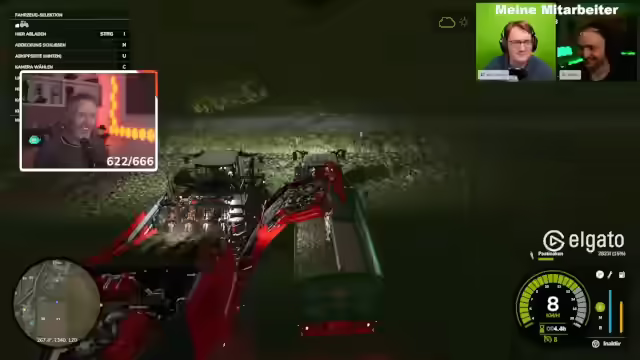 00:08:15Es wird erwähnt, dass der Kanalrekord bei Stufe 16 liegt und es freischaltbare Emotes bei höheren Stufen gibt. Eine Information für die Zuschauer, dass sie mit ihren Sub-Aktionen bis Sonntag warten sollen, da es dann wieder Geld gibt und etwas im Minecraft-Game passiert. Der Streamer erklärt, dass sie etwas gekauft haben und fragt, wie Memre durch einen Cheat ins Spiel gekommen ist. Die Gruppe begibt sich ins Spiel und sucht die anderen beiden Spieler. Es wird überlegt, wie man am besten ins Spielgeschehen eingreift, und schließlich beschließt der Streamer, mit einem Auto in die Ernte einzurasen. Es wird festgestellt, dass die anderen Zuckerrüben ernten und einen Auftrag angenommen haben, bei dem das Erntegerät keinen internen Tank hat und man permanent vorbeifahren muss. Der Streamer bietet seine Hilfe an, indem er den anderen Traktor mit Anhänger holt, obwohl dieser klein ist. Es wird über die Schwierigkeiten des Auftrags gesprochen, insbesondere die geringe Kapazität des Anhängers und die Notwendigkeit, ständig abwechselnd einzuladen.