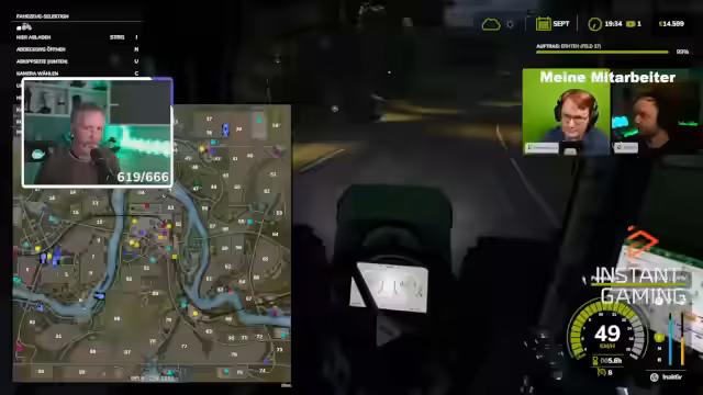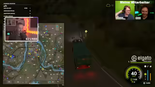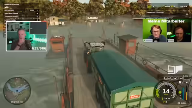 00:19:16Die Auftragsabwicklung gestaltet sich schwierig. Der Streamer und ein Mitspieler namens Debiotr koordinieren das Be- und Entladen mit einem kleinen, unzureichend dimensionierten Anhänger. Dabei kommt es zu Missverständnissen bei der Bedienung des Tempomats und der Füllanzeige des Anhängers, die Grafik-Bugs aufweist. Die Kommunikation zwischen den Spielern ist teilweise eingeschränkt, was die Situation zusätzlich erschwert. Es werden verschiedene Routen zur Transportabgabe getestet, darunter auch eine Fähre.