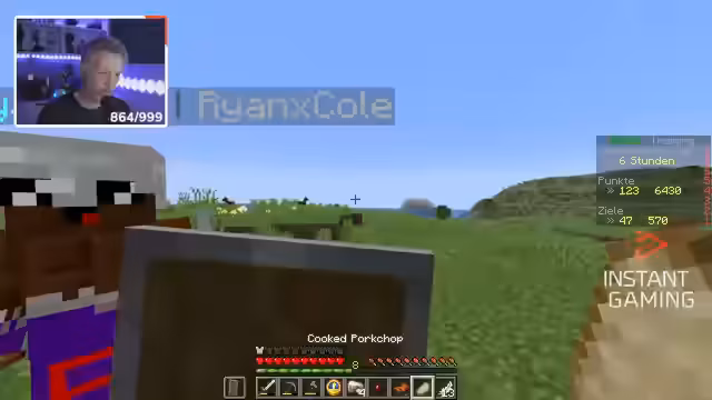 00:34:05Die ersten Schritte in der Welt dienen dem Sammeln der grundlegenden Ressourcen und dem Absolvieren einfacher Advancements. Beide Spieler sammeln Erde und Stein, was die ersten Punkte bringt. Es werden erste Kämpfe gegen Mobs wie Zombies und Skelette geführt, um weitere Achievements zu erhalten und sich grundlegende Ausrüstung wie ein Schwert und ein Schild herzustellen.