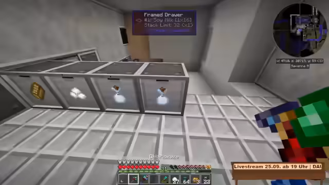 02:29:19Der Streamer richtet ein Rüstungsgeschäft mit verschiedenen Rüstungsständen und Dekorationselementen ein. Er verwendet Bibliocraft-Möbel und Uhren für die Ausstattung. Es werden verschiedene Rüstungstypen wie Leder, Eisen, Gold und Diamant gezeigt. Der Streamer experimentiert mit verschiedenen Farbkombinationen und stellt fest, dass einige Rüstungen wie Kettenrüstung nicht so gut aussehen. Er plant auch, einen Kran zur Dekoration zu installieren, was jedoch zu Herausforderungen führt.