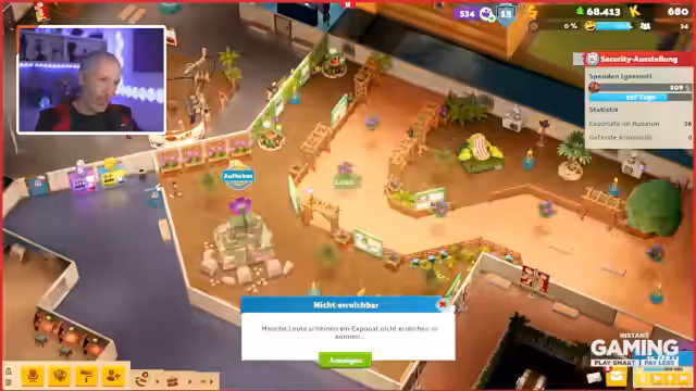 00:02:10Der Livestream beginnt mit einer Ankündigung für zwei Spiele: Zuerst wird das Museumsspiel gespielt, anschließend folgt der Tavern & Ale Simulator mit Flocke und Shawn. Der Streamer erwähnt den Supporter Schoko-Tom als den ersten offiziellen Zuschauer. Die erste Phase des Streams wird vom Museumsspiel dominiert, wobei der Streamer sein Museum weiter ausbaut, Exponate analysiert und Mitarbeiter mit speziellen Aufgaben, wie der Heilung von Krankheiten, beschäftigt.