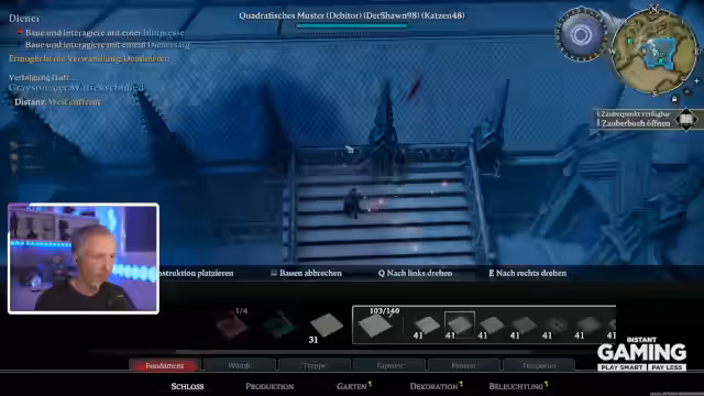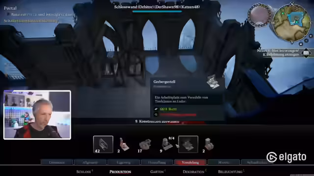 01:42:29Ein zentraler Aspekt des Streams ist der Aufbau und die Erweiterung des Schlosses. Der Spieler plant Räume, craftet Truhen und organisiert Ressourcen wie Stein, Holz, Kupfer und Leder. Es werden verschiedene Gebäude wie Schmieden, Gerbereien und Blutpressen erwähnt. Der Spieler arbeitet daran, das Schloss effizienter zu gestalten, mit strategisch angeordneten Räumen und Ressourcenlagern. Das Ziel ist die Schaffung eines optimalen Lagers und Arbeitsbereichs.