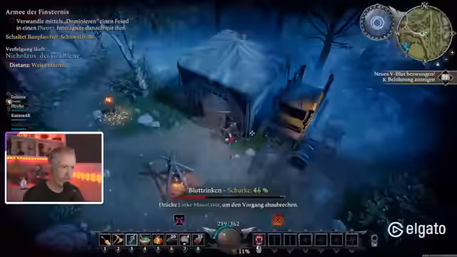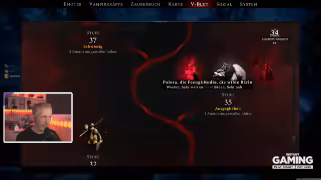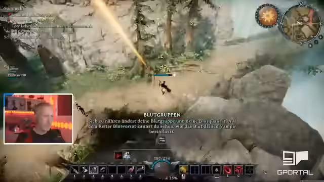 03:28:36Der Streamer nutzt Teleporter im Schloss, um sich schneller fortzubewegen, und erklärt die Vorteile des Vampir-Daseins, insbesondere die Fähigkeit zu teleportieren. Er verfolgt aktiv V-Blut-Träger mit Hilfe des V-Blut-Menüs und jagt spezifische Gegner wie den Gores Winde der Verwüster. Auch die Notwendigkeit, drei Wie-Blut-Träger zu töten, wird erwähnt.