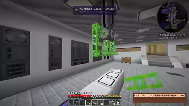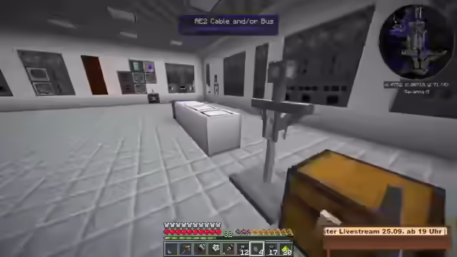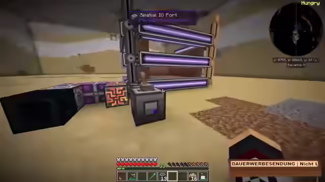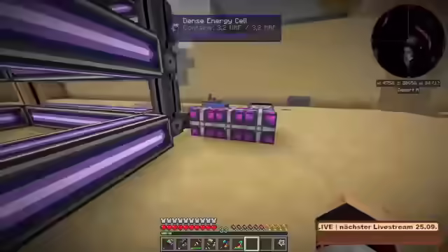03:49:49Es wird die automatische Neterquarzmaschine vorgestellt, die in der letzten Folge gebaut wurde und weiterhin fleißig arbeitet. Die Maschine kann bei Bedarf an- und ausgeschaltet werden. Es wird erklärt, dass das Design der Maschine ein Sägeblatt darstellt, das Holz zersägt. Der Fokus liegt auf dem Bau eines Monitor-Setups, um den Überblick über die produzierten Ressourcen zu behalten. Es werden Monitore und Kabel des ME-Systems benötigt. Da nicht genügend Kanäle vorhanden sind, wird das Ganze getunnelt. Es wird kurz geprüft, ob das Mikrofon eingeschaltet ist. Der Streamer zeigt die Dance-Kabel an der Decke und überlegt, wie diese versteckt werden können. Die Monitore sollen auf einer bestimmten Höhe angebracht werden und mit normalen Kabeln verbunden werden. Es wird mit verschiedenen Kabelfarben experimentiert, um das Setup optisch ansprechender zu gestalten. Es werden Bedenken geäußert, ob die Channel der Monitore richtig aufgeteilt sind. An den Ecken sollen keine Monitore angebracht werden, sondern nur vorne und hinten, um die wichtigsten Ressourcen wie Neterquarz anzuzeigen.