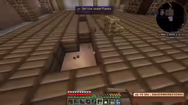 00:52:18Es wird an der Raumgestaltung gearbeitet, wobei anfängliche Fehler korrigiert und Schrägen in das Design integriert werden. Es wird über die Anordnung von Blöcken und die Platzierung von Möbeln wie Bücherregalen und einem Bookbinder nachgedacht. Die schiefe Bauweise des Raumes wird humorvoll kommentiert, und die Notwendigkeit eines Architekten wird erwähnt. Es wird live demonstriert, wie ein Raum entsteht, wobei sowohl gute als auch schlechte Überlegungen einbezogen werden. Die Decke wird bearbeitet und verschiedene Blöcke wie Spruce Wood Planks werden verwendet. Es wird festgestellt, dass die Decke noch bearbeitet werden muss. Die Idee eines Super-Bilders-Wand wird in Betracht gezogen, was jedoch das Verlegen des Drachen und das Finden aller Schallplatten erfordern würde. Es wird überlegt, Portale im Raum zu platzieren und diese mit Kristallen zu unterteilen, wobei festgestellt wird, dass nicht genügend Kristalle vorhanden sind und eine Reise in eine Kristallwelt notwendig wird. Es wird ein Kommentar erwähnt, dass es manchen Zuschauern nicht um die Modifikationen selbst geht, sondern darum, was man damit macht und wie man sie einbaut.