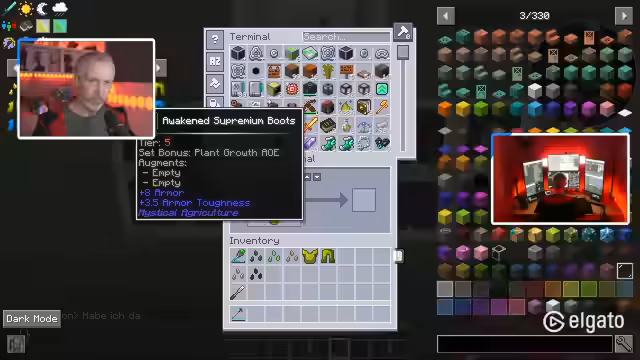 00:54:14Um von den Serverproblemen abzulenken, wechselt Streamer in die Farmwelt, um dort seltene Ressourcen abzubauen. Er sammelt Drachenseelen für eine Quest im All the Modium. Das Crafting für ein bestimmtes Seed erfordert mehrere seltene Zutaten wie Dragon Egg Essence, Insanium Blöcke und Netastar Crux. Der Prozess wird durch die serverseitigen Lags und die Langsamkeit der Herstellung kompliziert. Der Aufbau des Altars für das Rezept wird gezeigt und das Fehlen einiger Zutaten wird bemerkt.