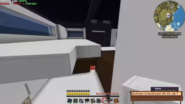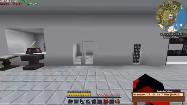 11:01:26Die technische Ausstattung des Hauses umfasst eine umfangreiche Galacticraft-Abteilung, die nach dem Bau einer Rakete etwas aufgeräumt wurde. Von dort aus kann man zu verschiedenen Planeten fliegen. Es gibt eine absaugbare Poolfunktion und die Anfänge von Pneumaticraft, wobei die Fahrstühle als sehr aufwendig beschrieben werden. Die Mondbasis, die für ein späteres Projekt wiederverwendet werden soll, ist ein weiteres großes Ziel und befindet sich noch im Aufbau.