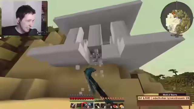 00:26:15An der Oberfläche angekommen, suchen die Spieler nach Schafen und Essen. Sie entdecken eine Wüste und einen Meteoriten. Es wird dunkel, und die Spieler benötigen Essen. Sie finden Gurken in Gärten. In der Wüste werden Creeper gespawnt. Ein Spieler macht Essen. Die Spieler teilen Essen und besiegen Skelette. Sie entdecken helleren Sand, der Diamanten verspricht, und einen Lucky Block auf einem Berg. Ein Dorf wird gefunden. Beim Öffnen eines Lucky Blocks werden die Spieler in die Luft geschleudert. Sie finden Diamanten und ein Biegen. Ein Rackenburg wird gefunden und soll zu Hause aufgestellt werden. Die Spieler teilen die gefundenen Ressourcen. Ein Desert-Tempel wird entdeckt. In der zweiten Folge soll die Stadt gesprengt werden. Es werden Folgentitelideen gesammelt. Ein weiterer Lucky Block wird geöffnet und Essen gefunden. Die Spieler stellen Öfen auf und planen, Diapickes zu bauen. Zwei Beacons werden gefunden. Die Spieler teilen die Beacons und gebratene Kartoffeln. Ein weiterer Tempel wird entdeckt.