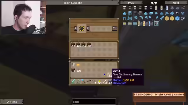 05:56:37Es wird überlegt, Electric Steel für die Jetta-Branch herzustellen, was aber nicht so einfach ist. Stattdessen soll eine Batterie gebaut werden. Es wird festgestellt, dass kein Glas mehr vorhanden ist. Ein Aloysmater wird benötigt. Es wird primär nach Osmium gesucht. Das System ist voll und soll aussortiert werden. Es wird überlegt, dem Heiko ein paar Disketten zu bauen. Für die Batterie werden Silber und Gold benötigt. Das System wird geleert. Ein Leads on Energy Cell soll gebaut werden. Es wird Eisen benötigt, um den Energy Cube zu bauen. Die Energy-Sachen sollen aus Thermal Expansion und die anderen Sachen aus Mechanismen genommen werden, um sich nicht ins Gehege zu kommen. Invar Ingots werden für die nächste Stufe benötigt. Der Filler wird im Wegrasiermodus aktiviert. Es werden unbedingt Spawner und Kisten vor den Marker gesetzt, weil die sonst weg sind.