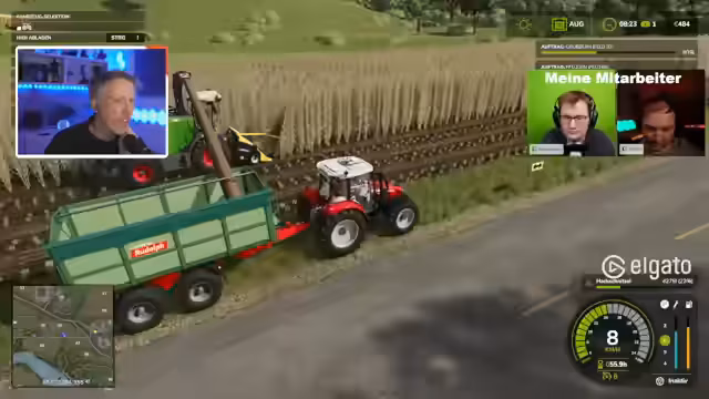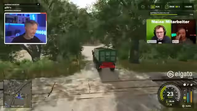 01:24:02Der Streamer berichtet von einem 'atomaren Befall' (genannt 'The Joke Craft'), der Felder zerstörte und eine Neubepflanzung erforderlich machte. Landwirtschaftliche Arbeiten wie das Striegeln (Unkrautentfernung) und das Abtransportieren von Wolle werden thematisiert. Für die Pappelernte werden verschiedene Maschinenoptionen verglichen: Ein Feldhäcksler kostet zwischen 500.000 und 630.000 Einheiten, während ein Mietfeldhäcksler (z. B. von Klaas) für 24.000 Einheiten plus 13.000 pro Stunde genehmigt wird. Die Entscheidung, Hackschnitzel zu produzieren und zu verkaufen, wird als kurzfristige Einnahmequelle diskutiert, wobei die Anmietung eines zusätzlichen Anhängers für den Transport geplant ist.
