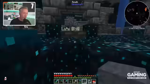 00:58:09Der Streamer beschließt, die Höhle unter seiner Basis auszuleuchten. Dabei stößt er auf eine Höhle im Deep Dark, wo er mit dem Warden konfrontiert wird. Er kann den Warden durch geschicktes Vorgehen, z.B. durch Umlenken seiner Aufmerksamkeit und durch das Platzieren von Wolle, umgehen. Später führt er gezielte Expeditionen tiefer in den Deep Dark durch, um dort wertvolle Ressourcen wie Redstone und Diamanten zu farmen.