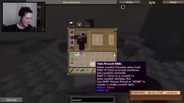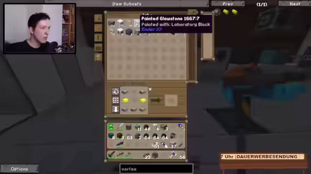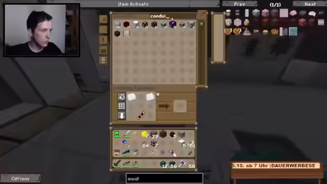 09:53:15Der Streamer setzt Pneumatik-Kram fort und möchte einen geheimen Fahrstuhl bauen. Er benötigt Säure und stellt fest, dass sein Bucket of Säure leer ist. Er findet weitere Säure in seiner Pneumatic Craft Vorzeugekiste. Er möchte Galactic Craft im Livestream machen, um von Planet zu Planet zu fliegen. Er will eine Pfütze mit Säure machen, um Edged Acid herzustellen. Er braucht rote Blumen für Plastik und Deko-Craft. Er möchte mit Easy im Möbelhaus einkaufen gehen. Er will eine Blumenfarm bauen und benötigt dafür einen Autonomous Activator, Grass und Conduits. Er baut ein Feld und platziert Grass. Er benötigt Energie-, Redstone- und Item-Conduits.