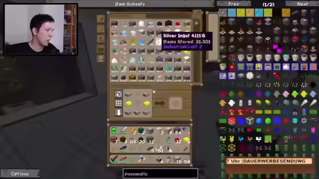 06:02:14Die Folge setzt den Fokus auf Pneumatic Craft, wobei der Aufbau optimiert wird, indem das Laber-Ding weggelassen und vier Kompressoren direkt angeschlossen werden. Es wird festgestellt, dass bereits 25 Einheiten LPG vorhanden sind, was für die geplanten Vorhaben ausreichen sollte. Der Plastik Mixer und graues Plastik werden benötigt, wobei Rot, Grün und Lapis Lazuli als Zutaten identifiziert werden. Es wird festgestellt, dass Liquid Plastik hergestellt werden muss, wofür die Pneumatic Processing Plant benötigt wird. Diese soll entweder umgebaut oder im oberen Bereich neu errichtet werden. Nach einer kurzen Unterbrechung durch Rasenmäherarbeiten wird die Pneumatic Processing Plant gebaut, wobei Kohle benötigt wird. Es wird festgestellt, dass die Kohle im System knapp ist, und es wird geplant, das System zu trennen, um den Überblick zu behalten. Zusätzlich werden Pneumatic Tubes, ein Electric Compressor und Enderkonduits benötigt. Der Plastikmixer soll mitgenommen werden, obwohl er auch Hitze benötigt. Es wird festgestellt, dass eine Vortex-Tube fehlt. Der Keller nimmt langsam Gestalt an, wobei die Temperatur dort ideal ist. Es wird festgestellt, dass bereits 290 Eimer abgesaugt wurden. Es wird geplant, den Aufbau effektiver und schöner zu gestalten, wobei die Ästhetik momentan zweitrangig ist. Es wird erwähnt, dass noch keine Stromversorgung benötigt wird.