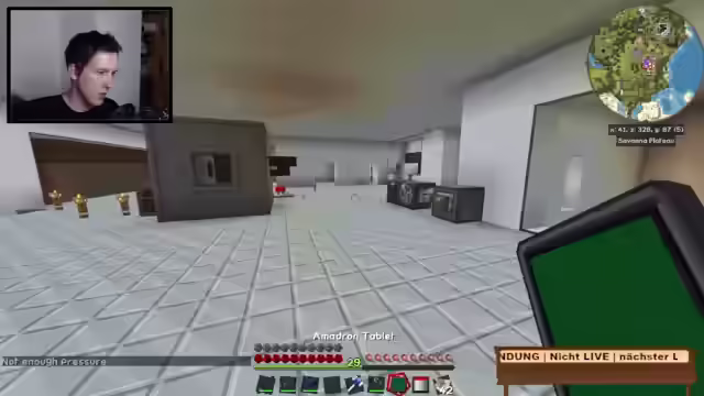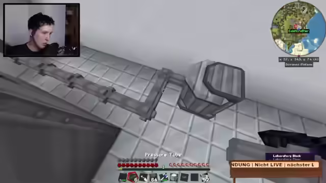 04:51:50Eine Höhle wird erkundet, um dort Eisen zu verarbeiten, da die Kompressionskammer für Compressed Iron zunächst Eisen benötigt. Essenceberry-Büsche werden gesucht und ein Teleporter genutzt. Compressed Iron Ingots werden für Pneumatic Craft benötigt, insbesondere für einen coolen Aufzug und das begonnene Wartezimmer. Pneumatic Craft erfordert Pressure Tubes, einen Air Compressor und Pneumatic Zylinder für eine Elevator Base. Pure Plastic wird aus Rain Plant Seeds gewonnen, die jedoch fehlen. Stattdessen wird überlegt, eine Pressure Chain Drop Wolf zu bauen, wofür Ventile und eine Window benötigt werden. Es werden Pressure Chamber Interfaces und Walls benötigt, um einen Multiblock zu bauen. Der Air Compressor wird als erster Schritt platziert und ein Untergrund für den Pressure Chamber geschaffen. Tipps von Zuschauern sind erwünscht. Ein Ventil, Input, Output und ein Fenster werden hinzugefügt, um den Prozess zu beobachten. Eine Anzeige für den Druck wird gebaut, und ein Fluxkompressor, der mit Strom betrieben wird, ist geplant. Elevator Frames werden benötigt, und ein Pressure Gawk Tube Modul wird gebaut. Redstone kann verwendet werden, um ein Signal auszugeben, wenn der Druck einen kritischen Bereich erreicht. Eisen wird in die Kammer gegeben, aber aufgrund des geringen Drucks wird es nur durchgeschleust. Tipps zur Einstellung des Drucks werden erbeten.