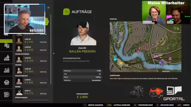 01:02:55Es wird über die Koordination beim Abladen von Stroh gesprochen, wobei der Wunsch nach einem "geilen Bauer, der nur rumschreit" geäußert wird. Der Realismus der Steuerung wird hervorgehoben. Der Kauf eines Hofes nach dem Let's Play wird als Option genannt, wobei 750.000 Startkapital benötigt werden. Es wird humorvoll über das monatliche Taschengeld gesprochen. Der Streamer bemerkt ein Reh im Spiel. Es wird über die Anschaffung eines Lenkrads und Streamdecks für ein intensiveres Spielerlebnis diskutiert, was als "Hardware-Cheaten" bezeichnet wird. Der Plan, auf dem mittleren Feld etwas anzupflanzen, wird erwähnt. Es können bis zu drei Lohnaufträge gleichzeitig gemacht werden. Ein Düngenauftrag wird angenommen, und es wird festgestellt, dass man die benötigten Maschinen gestellt bekommt, aber dann weniger verdient. Der Chat gibt Tipps zum Spiel, z.B. Tab drücken für neue Aufträge oder dass der Ingame-Sound zu laut ist. Es wird festgestellt, dass man den Auftraggeber anscheinend nochmal ansprechen muss, um die geliehenen Gegenstände zu bekommen. Der Chat schlägt vor, Ballen zu pressen, da dies am einfachsten sei. Der größte Auftrag bringt 11.000 Euro. Die gemieteten Maschinen warten beim Händler. Es wird über die Größe des Feldes diskutiert.